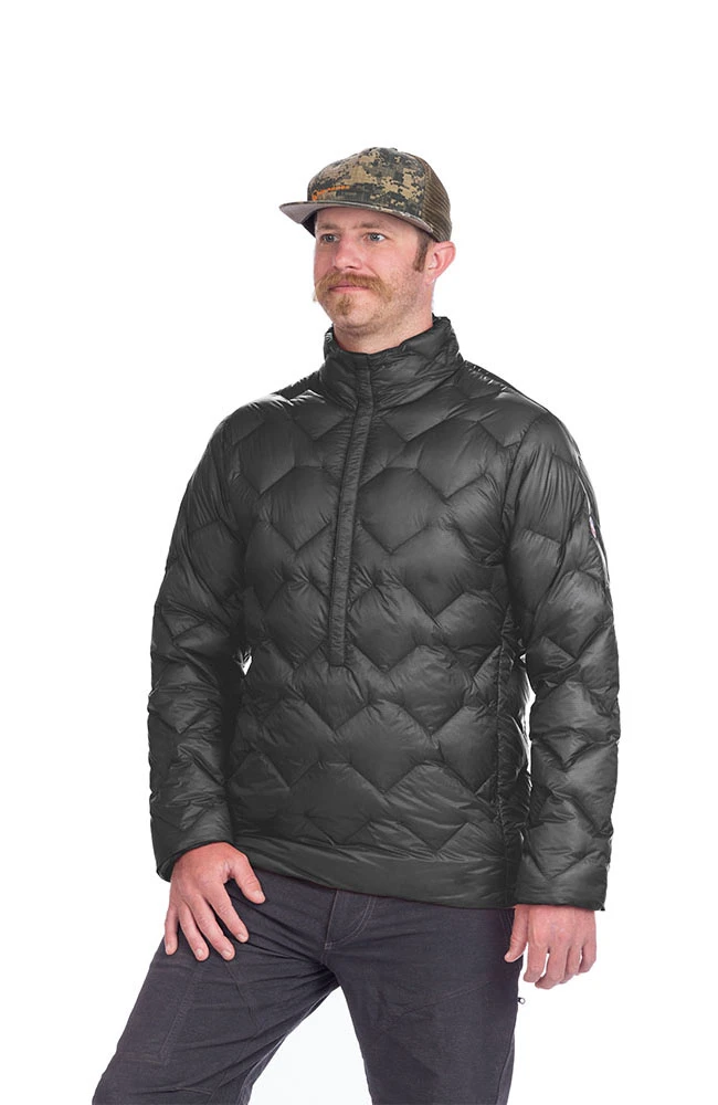 Super packable down pullover constructed with ultralight materials including UL snaps that eliminate the need for a full zipper